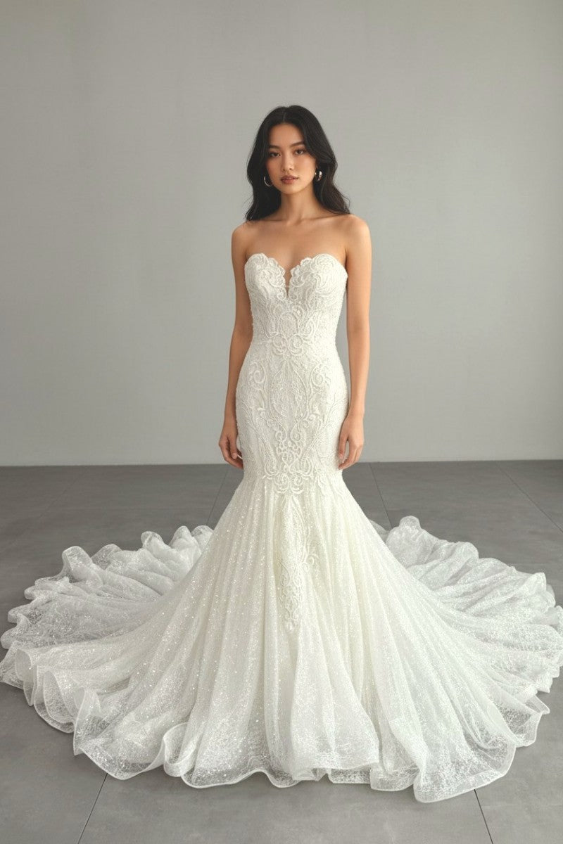 OKSANA MUKHの「Gia(ジーア)」は、繊細な刺繍レースと立体的なシルエットが印象的なマーメイドドレスです。 デコルテを美しく見せるハートカットと、ボディラインに沿って描かれる緻密なレース模様が、女性らしい曲線美を際立たせます。 裾に向かって広がるトレーンにはほのかな輝きが散りばめられ、動くたびに上品な存在感を放ちます。 洗練された華やかさを求める花嫁にふさわしい一着です。